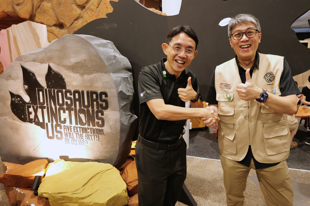 Dr Tan Swee Hee, Assistant Head of LKCNHM, and Mr Daniel Tan, Senior Director of Exhibitions and Galleries at Science Centre Singapore, celebrating the launch of ‘Dinosaurs | Extinctions | Us’. Image credit: LKCNHM, NUS