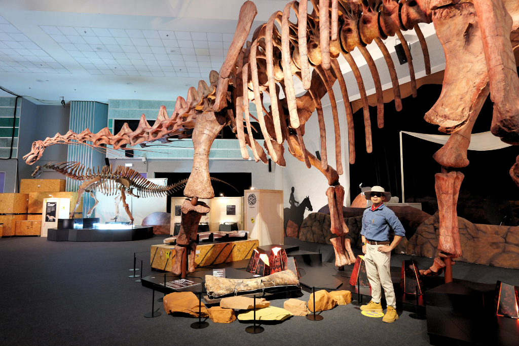 A LKCNHM staff (dressed as Dr Alan Grant from the hit movie ‘Jurassic Park’) stands under the Patagotitan mayorum. Image credit: LKCNHM, NUS