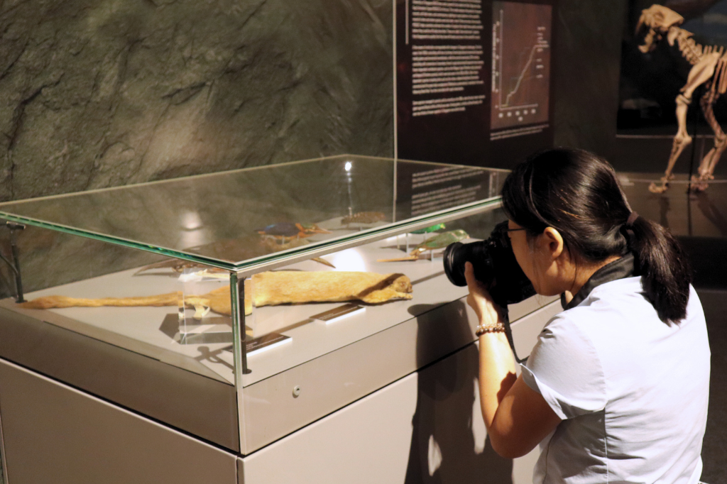 A guest takes a photo of the cream-coloured giant squirrel specimen that is on display. Image credit: LKCNHM, NUS