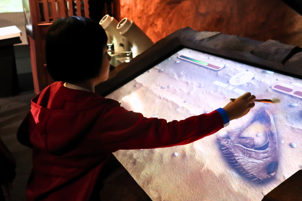 A visitor trying her hand at the interactive challenges that tested our strength, creativity, and prowess for paleo work. Image credit: LKCNHM, NUS
