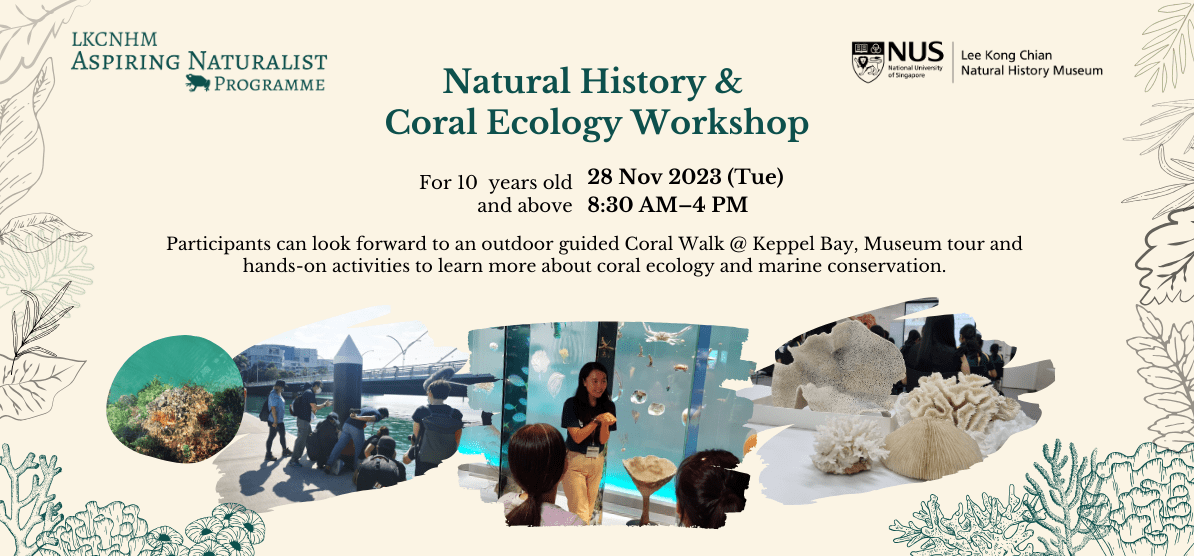 Our annual “Aspiring Naturalist Programme” is back with two new themed workshops this year: Natural History & Coral Ecology Workshop and Natural History & Herpetology Workshop! Participants can look forward to themed guided Museum tours, hands-on activities and outdoor guided walks.