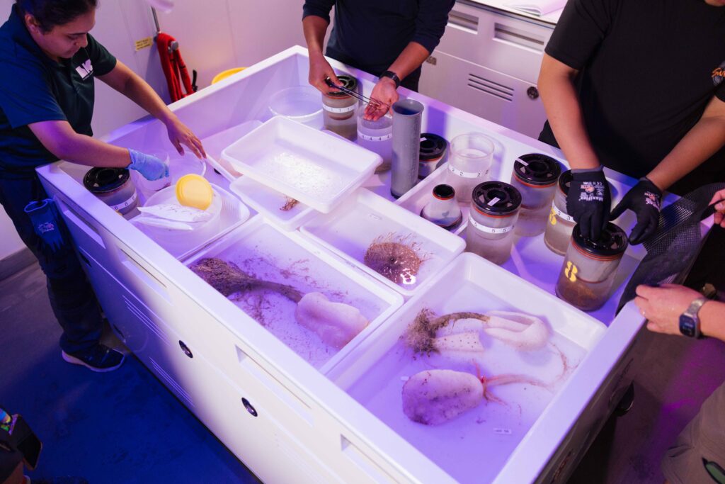 The ROV allowed them to retrieve fragile organisms such as sea cucumbers and jellies, while the lander allowed them to capture fast and agile organisms such as fish. The retrieved specimens were carefully sorted, photographed, and preserved. They will be kept in the Museum collections for future studies.