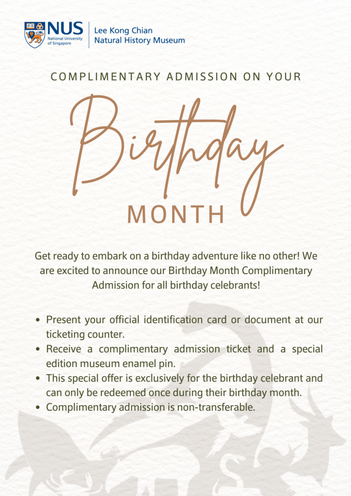 Your Birthday Month Celebration awaits at the Lee Kong Chian Natural History Museum! Embark on a birthday adventure like no other! We’re thrilled to announce our Birthday Month Complimentary Admission for all birthday celebrants.